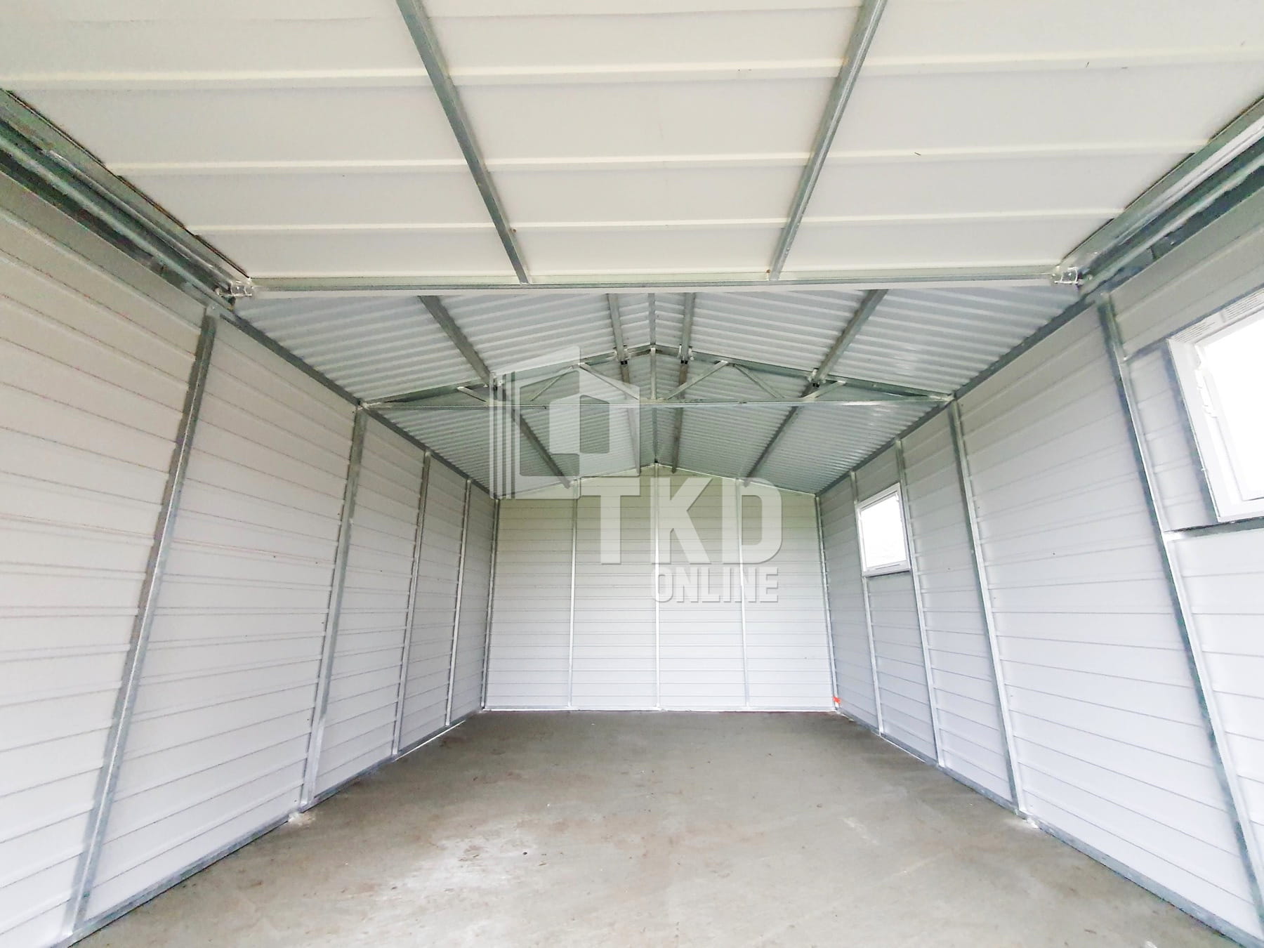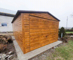 / Plechová garáž 3,5×6 – dvojkrídlové dvere – antracit + svetlý orech – imitácia dreva – strecha dvojspádová (sedlová) TKD82