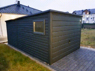 Plechová garáž 3×5 – výklopná brána – plastové okno výklopné – antracit – strecha spád dozadu TKD151
