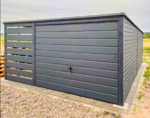 Plechová garáž 3×6 m + prístrešok 1,2 m – výklopná brána – antracit – strecha spád dozadu TKD254