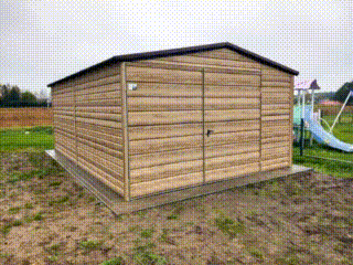 Plechová garáž 4×6 – dvojkrídlové dvere – winchester – imitácia dreva – strecha dvojspádová (sedlová) TKD121