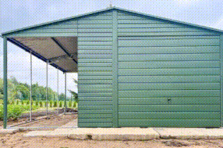 Plechová garáž 4x6m + prístrešok 2m – výklopná brána – dvere – 2x okno – zelená – rýny – strecha dvojspádová TKD256