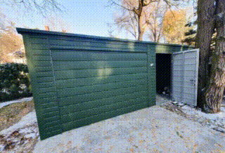 Plechová garáž 5,5×6 – výklopná brána – dvere – 2x výklopné okno – zelená – strecha so spádom dozadu TKD84