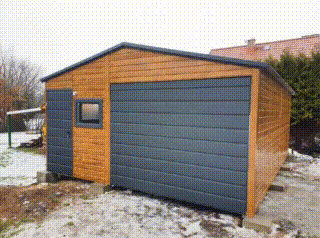/ Plechová garáž 5×6 – výklopná brána – 3x plastové okno výklopné – dvere – orech svetlý – imitácia dreva – strecha dvojspádová (sedlová) TKD92