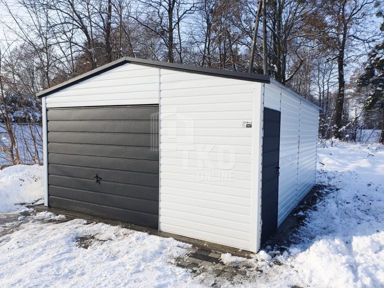 / Plechová garáž 5×6 – výklopná brána – dvere – biela + antracit – strecha dvojspádová (sedlová) TKD93