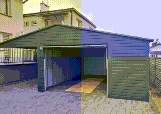 Plechová garáž 5x6m + prístrešok 4m – výklopná brána – antracit – strecha dvojspádová (sedlová) TKD327