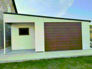 / Plechová garáž 5×6 m – výklenok 2 m – výklopná brána – plastové okno výklopné – dvere – biela – orech tmavý – strecha spád nabok TKD354