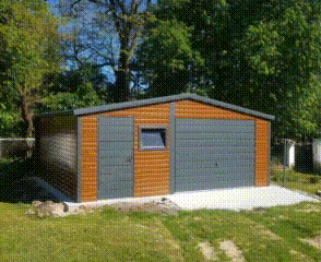 Plechová garáž 6×5 – výklopná brána – orech svetlý + antracit – imitácia dreva – dvere – 3x plastové okno výklopné – strecha dvojspádová (sedlová) TKD138