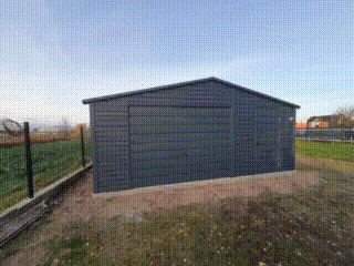 / Plechová garáž 6×6 – výklopná brána – dvere – plastové okno výklopné – antracit – strecha dvojspádová (sedlová) TKD101