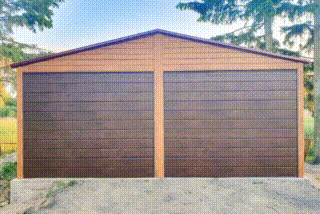 Plechová garáž 6m x 6m – 2x výklopná brána – 2x okno – dvere – orech svetlý + orech tmavý – imitácia dreva – rýna okapová – strecha dvojspádová TKD217