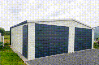 Plechová garáž 7×6 – 2x výklopná brána – rýna okapová – antracit + biela – strecha dvojspádová (sedlová) TKD143