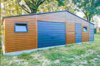 Plechová garáž 8,5×6 m + prístrešok 1,5x6m výklopná brána – dvere – 3x Okno – svetlý orech – imitácia dreva – antracit – strecha dvojspádová (sedlová) TKD263