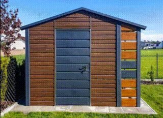 / Záhradný domček 2×2,5m + prístrešok – dvere – orech tmavý – orech svetlý – imitácia dreva – strecha dvojspádová (sedlová) TKD223